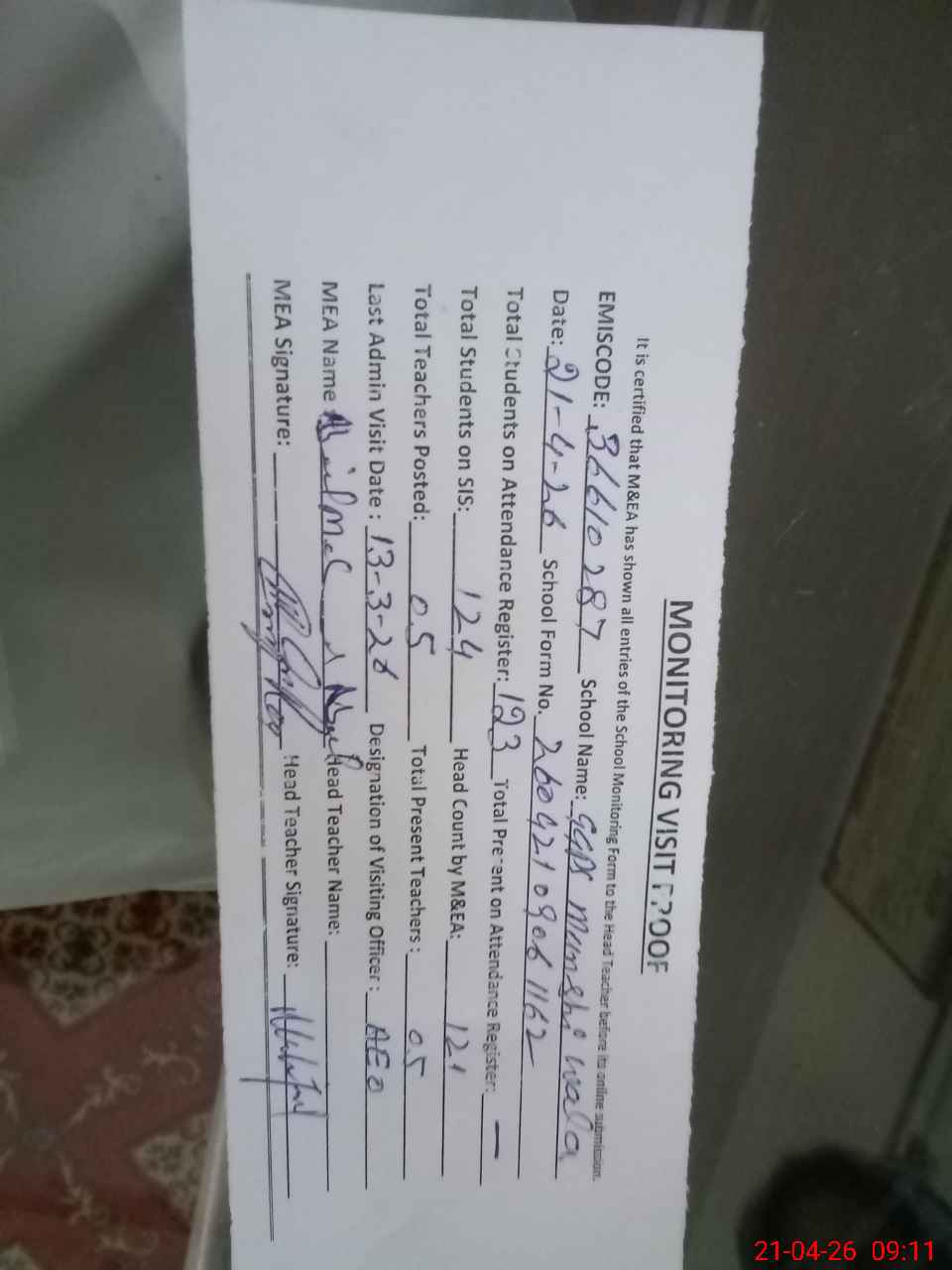 | Attendance Register | Head Teacher | MEA with School | Visit Proof |