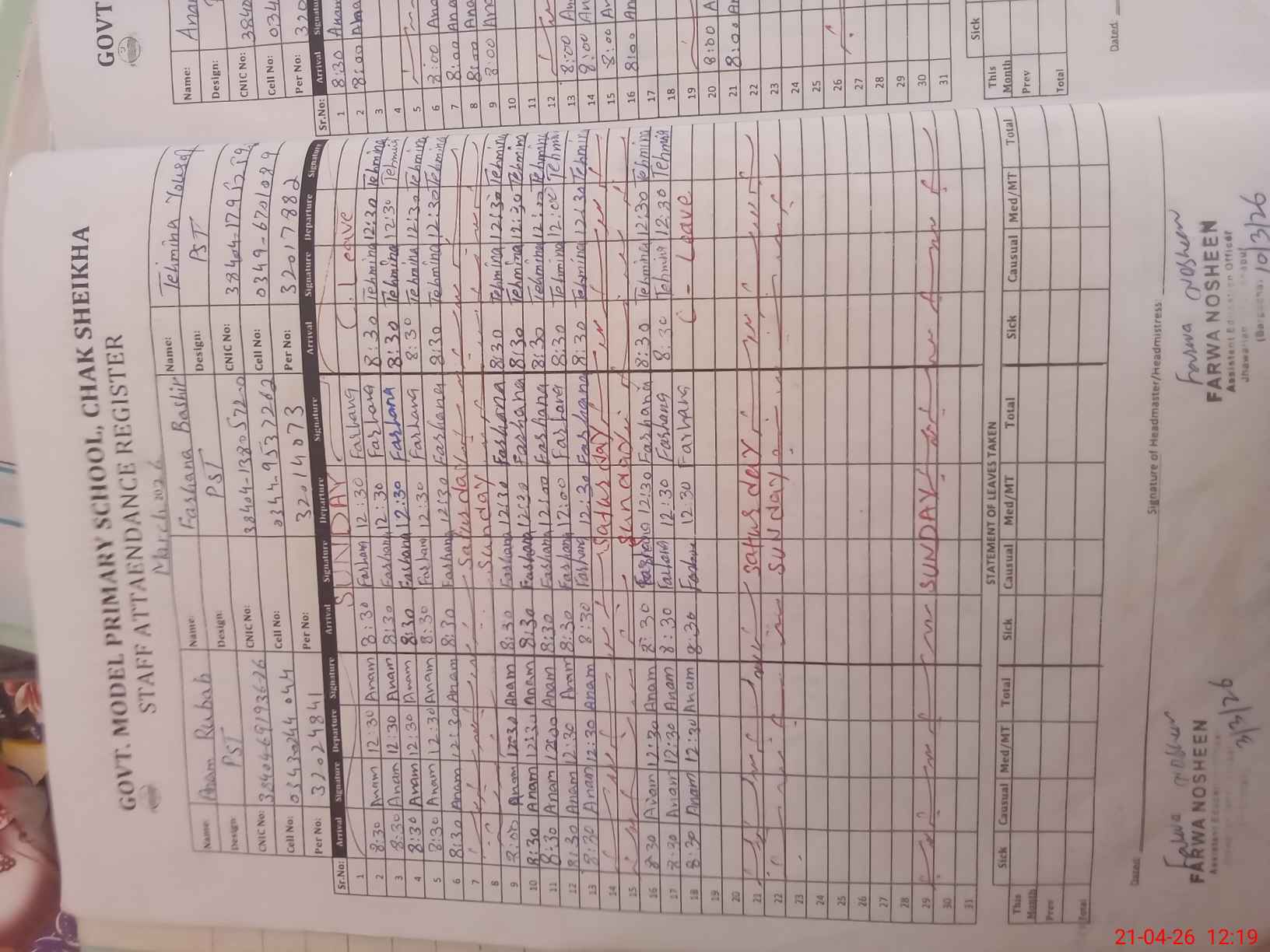 | CNIC | Full Name | Designation | R/C | Absence During Last Calender Month |