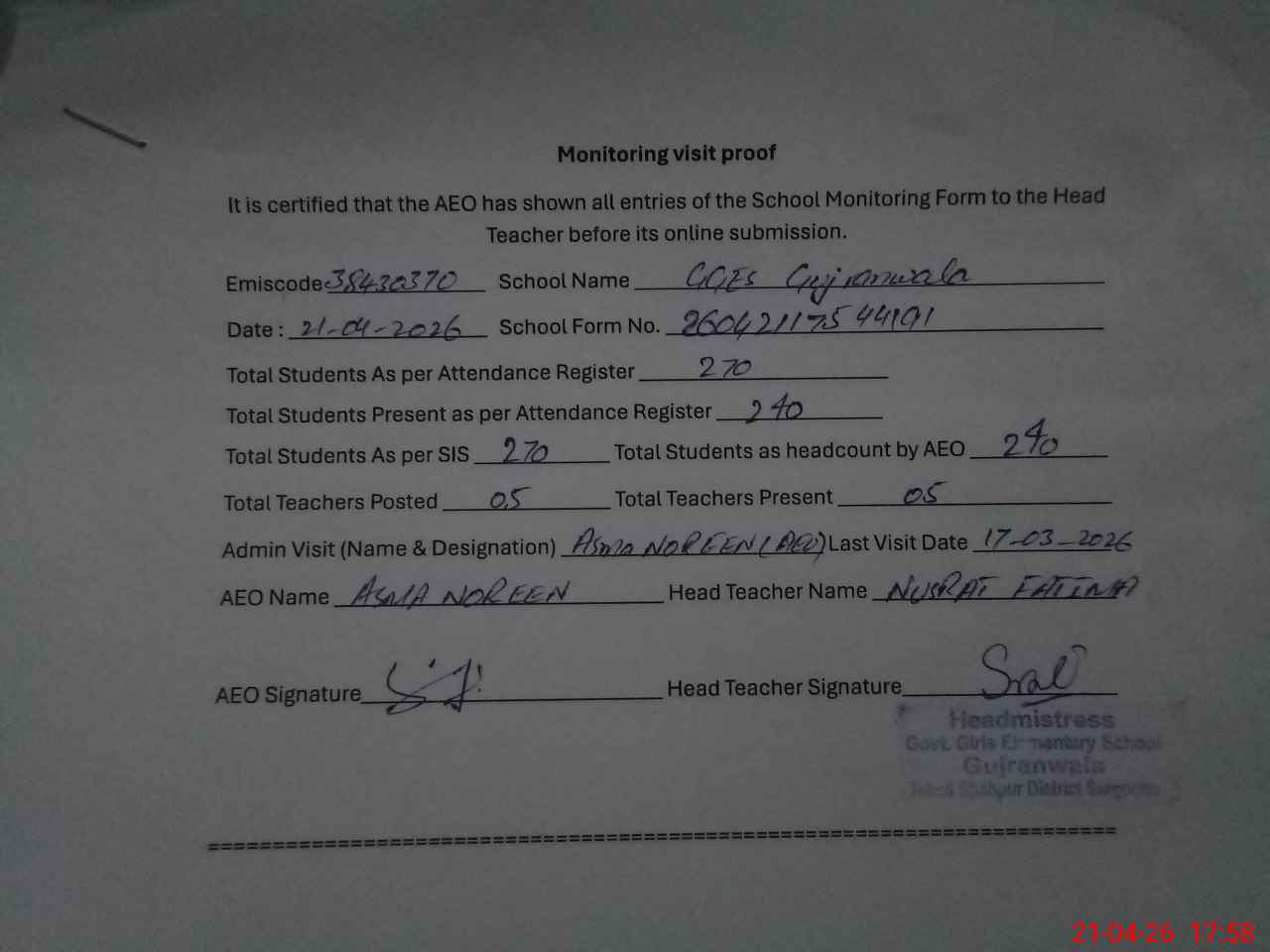 | EMIS Code: 38430370 | Name of School: GGES GUJRANWALA SHAHPUR | |||