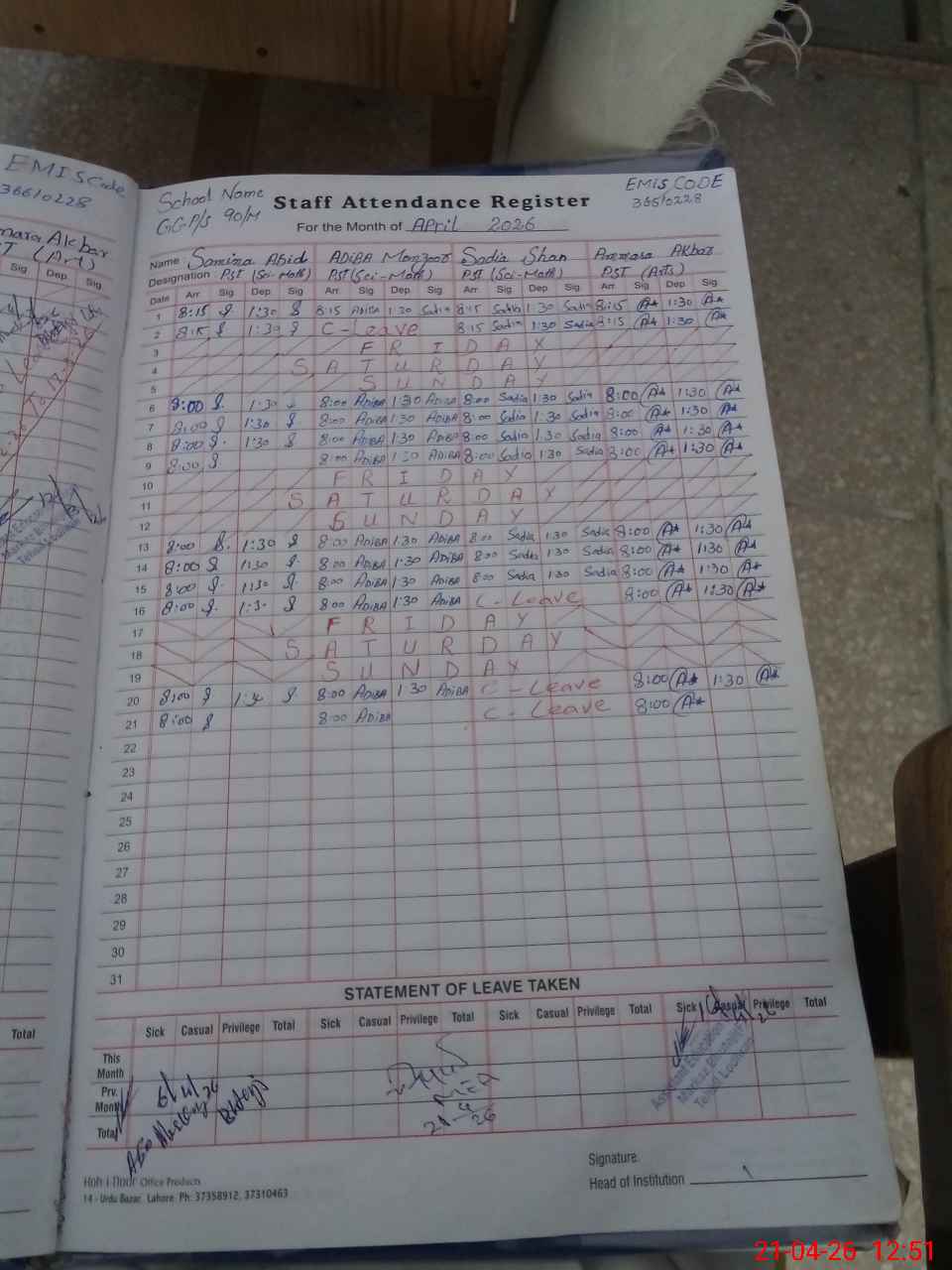| Leave | Duty | Absent | Maternity | Medical | Ex- Pak |