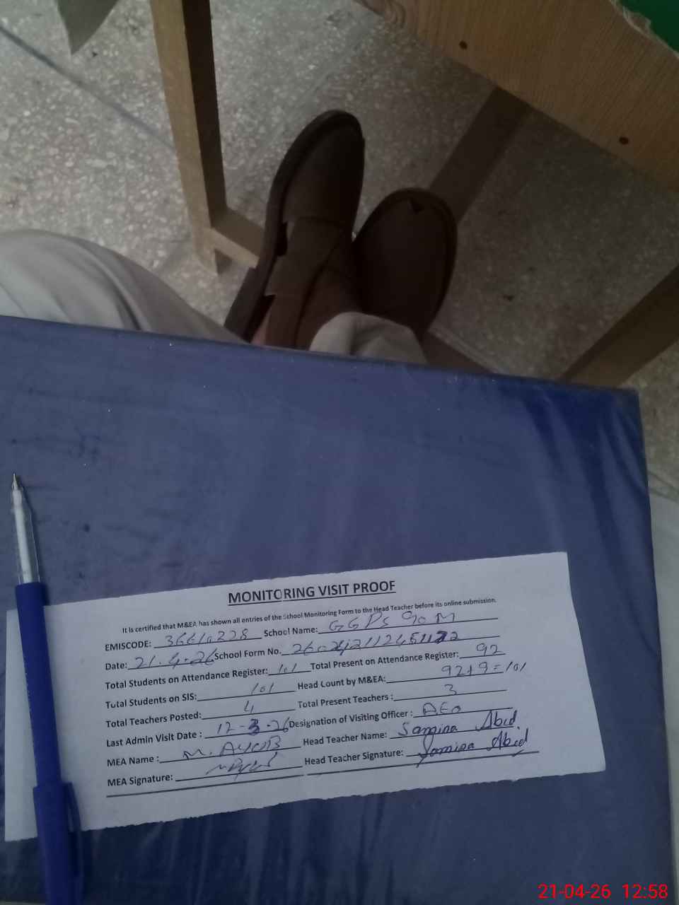 | Attendance Register | Head Teacher | MEA with School | Visit Proof |