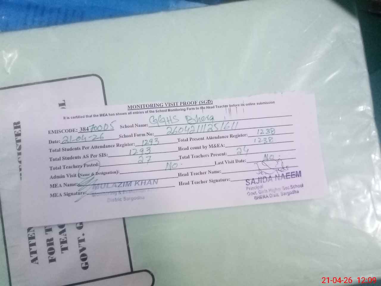 | District: SARGODHA | Tehsil: BHERA | Markaz: SECONDARY-WING | Level: H.Sec. | |
