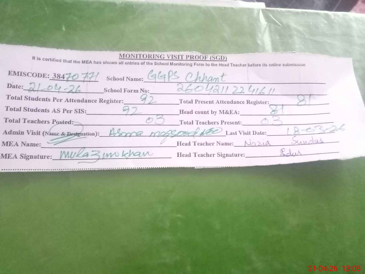 | Attendance Register | Head Teacher | MEA with School | Visit Proof |