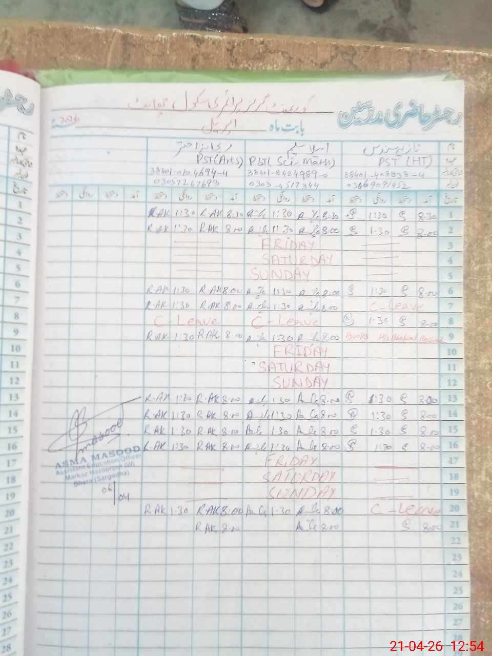 | Name: NA**** SU**** Designation: (School Headmaster's/Headmistress's) PST Phone/Cell Number: 03**** |