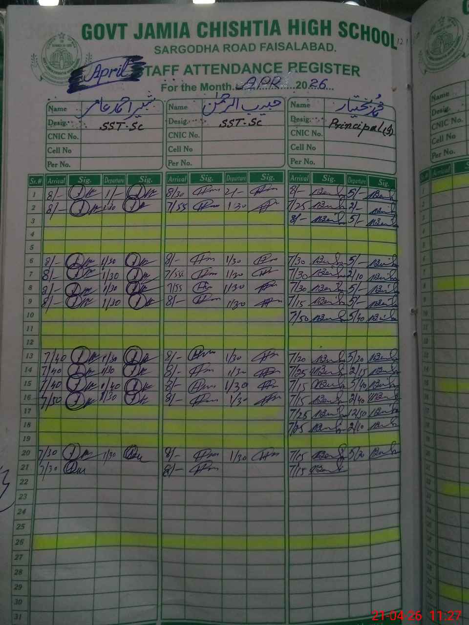 | CNIC | Full Name | Designation | R/C | Absence During Last Calender Month |