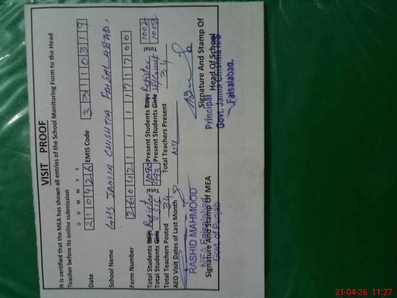 | Attendance Register | Head Teacher | MEA with School | Visit Proof |