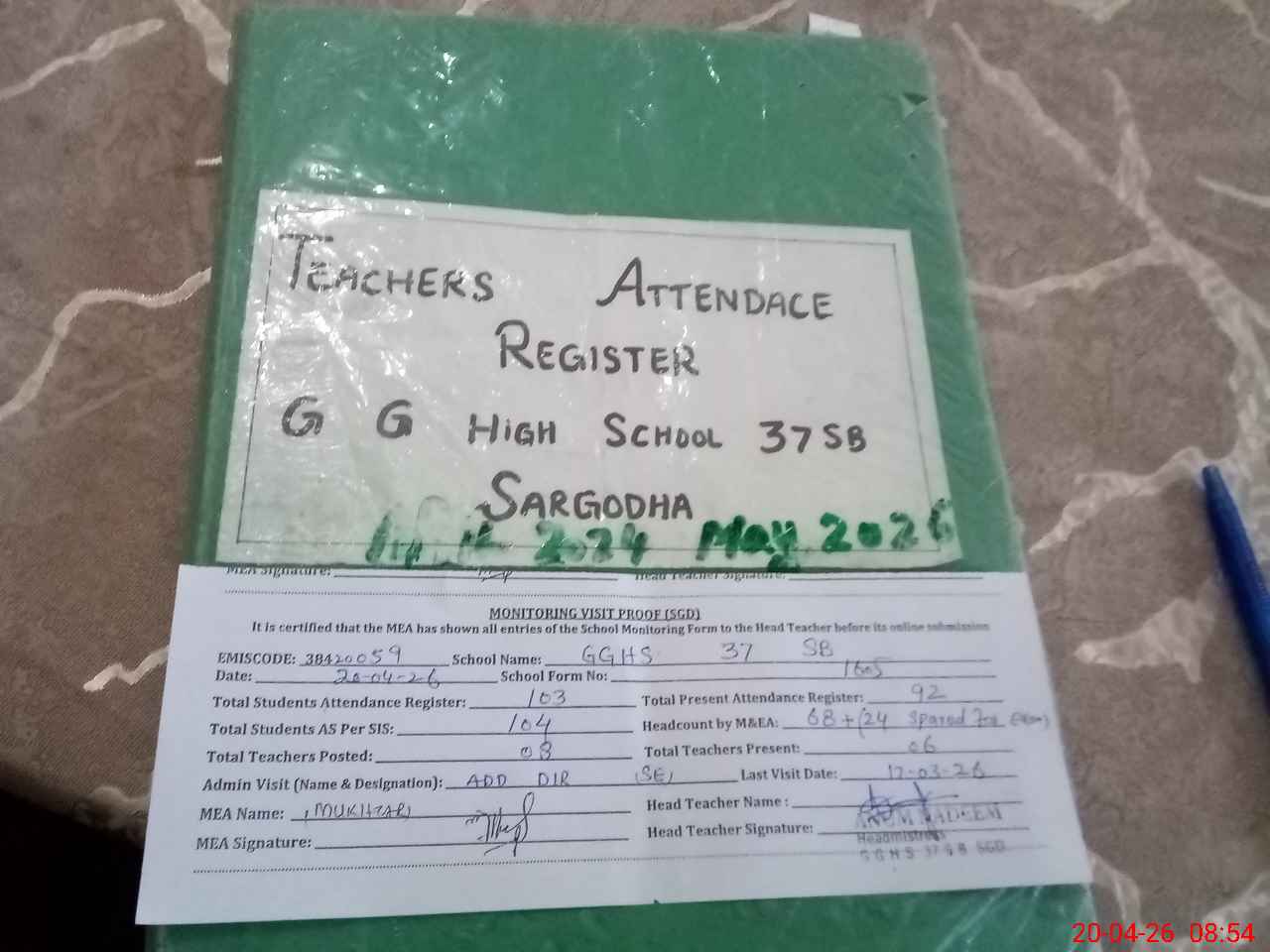 | Attendance Register | Head Teacher | MEA with School | Visit Proof |
