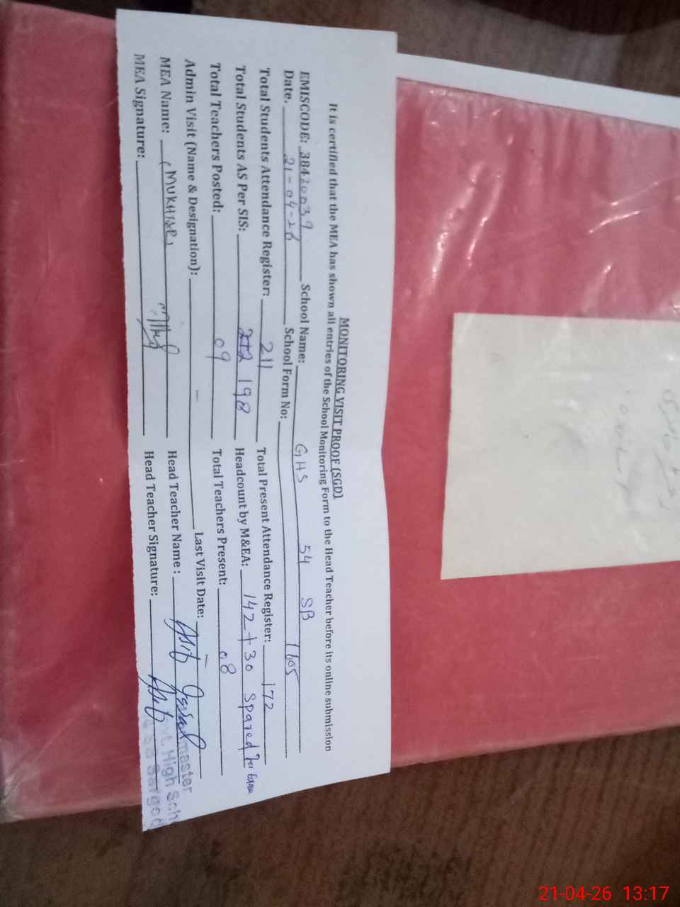 | Attendance Register | Head Teacher | MEA with School | Visit Proof |