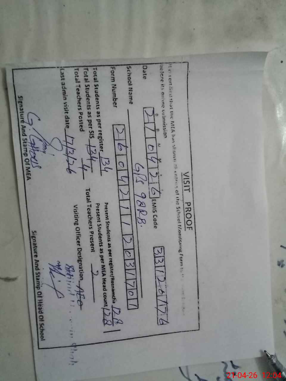 | Attendance Register | Head Teacher | MEA with School | Visit Proof |
