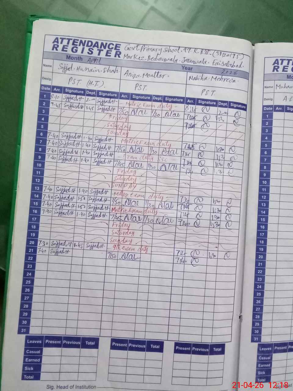 | Leave | Duty | Absent | Maternity | Medical | Ex- Pak |