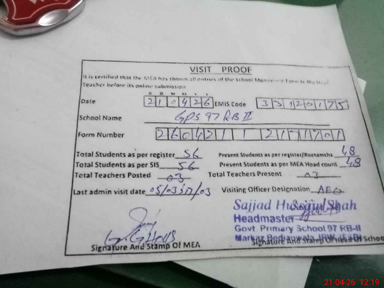 | Attendance Register | Head Teacher | MEA with School | Visit Proof |