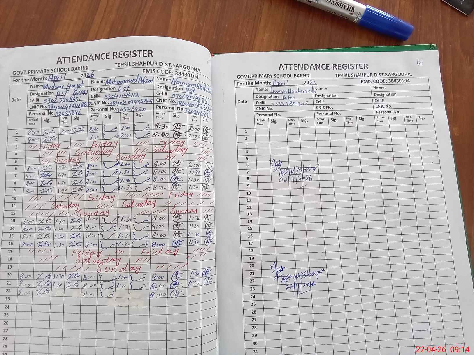 | CNIC | Full Name | Designation | R/C | Absence during last cal. month |
