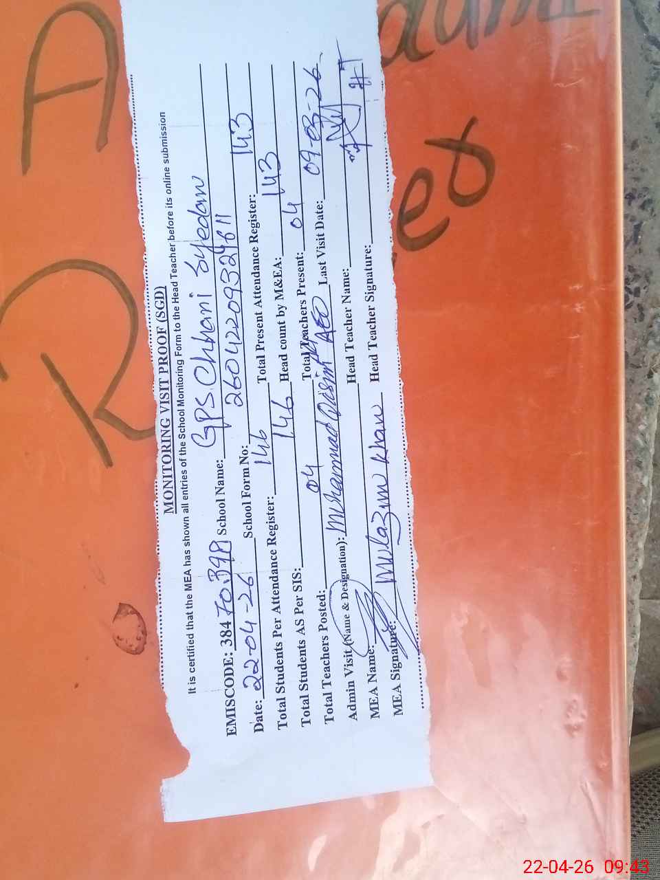 | Attendance Register | Head Teacher | MEA with School | Visit Proof |