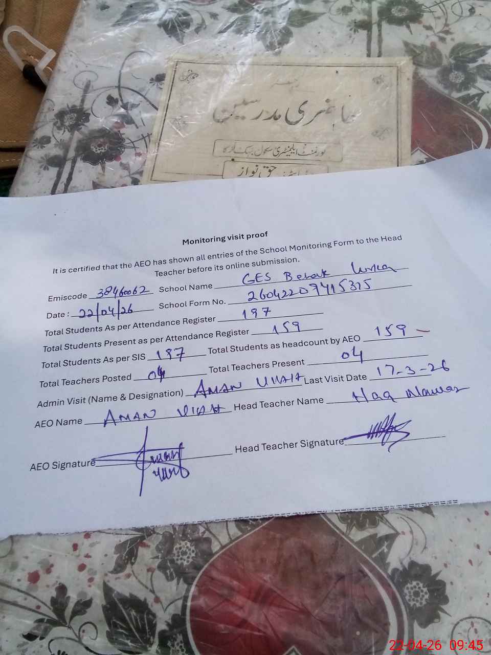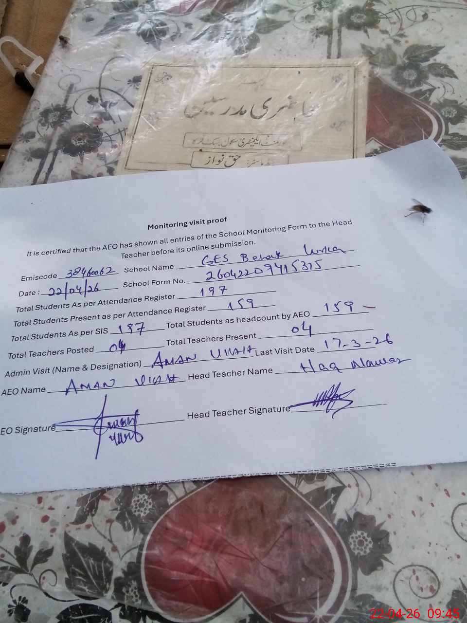 | Attendance Register | Head Teacher | MEA with School | Visit Proof |