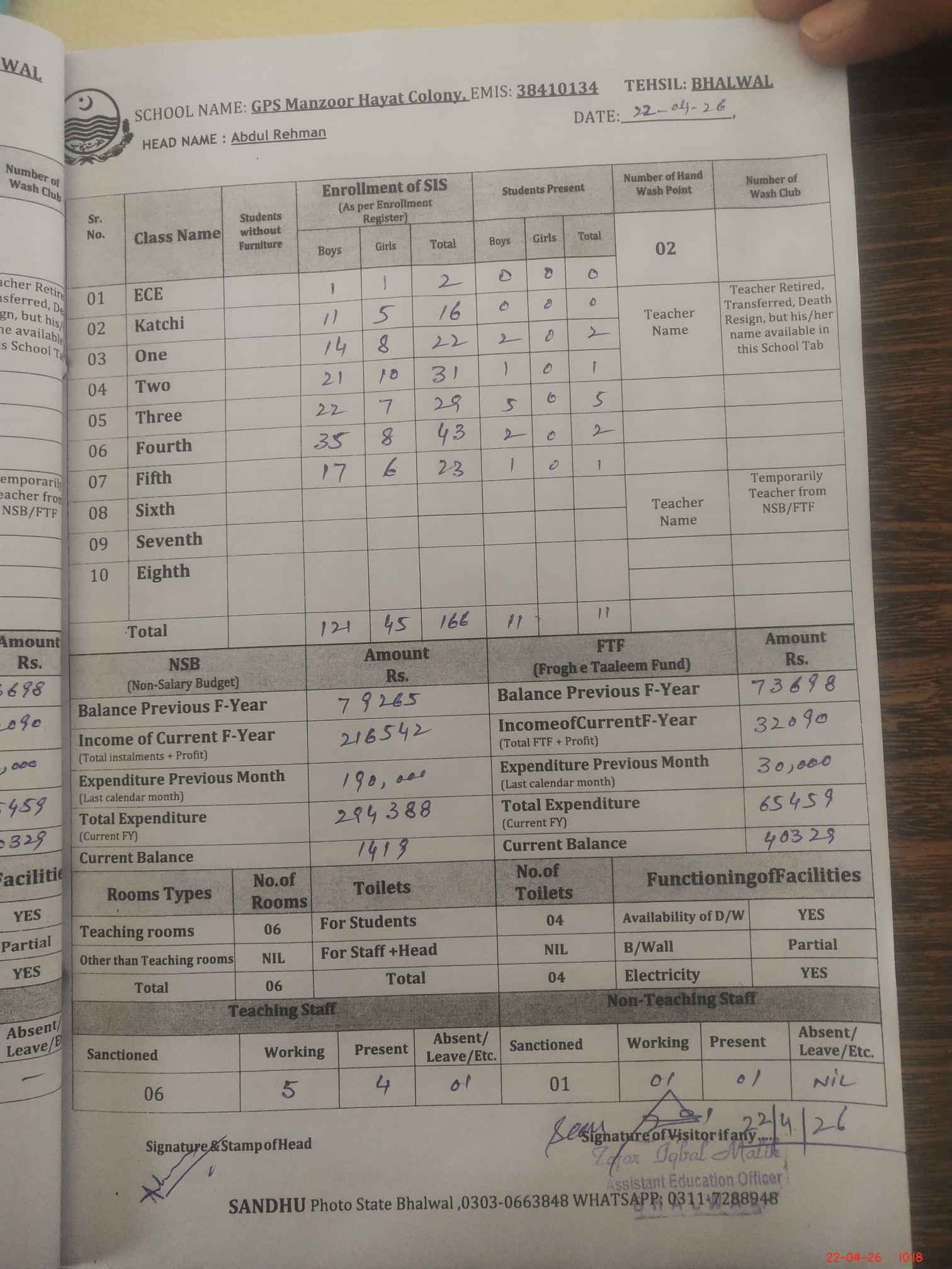 | EMIS Code: 38410134 | Name of School: GPS MANZOOR HAYAT COLONY BHALWAL | |||