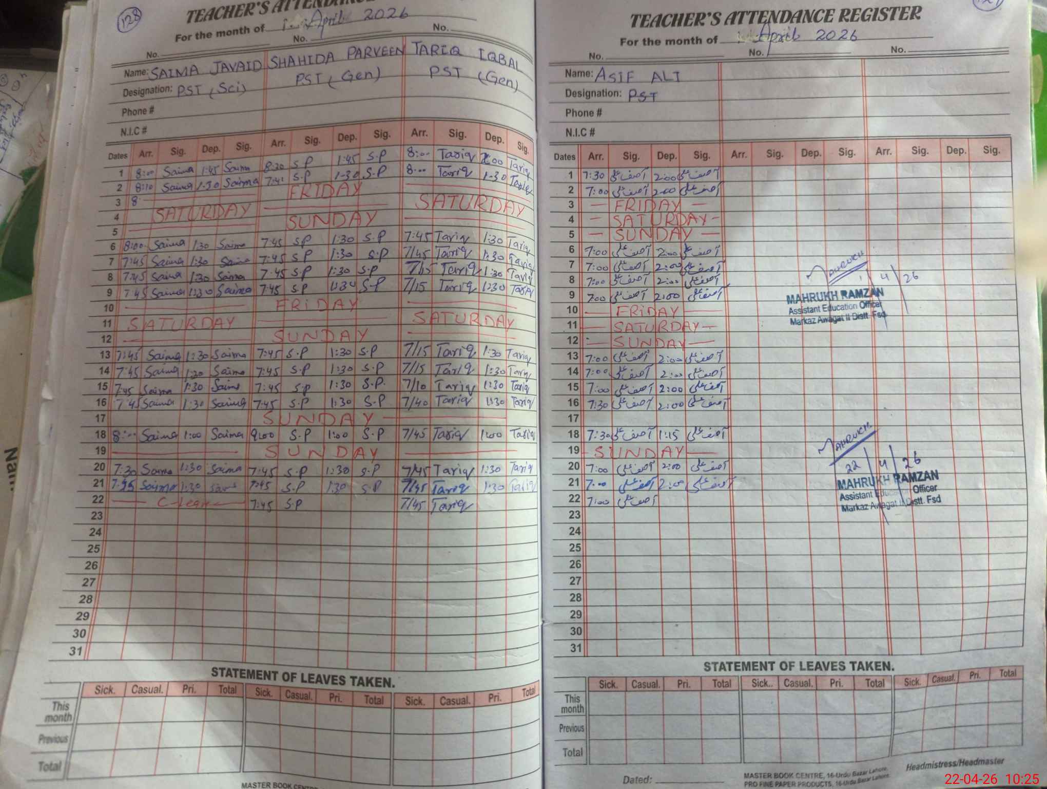 | CNIC | Full Name | Designation | R/C | Absence During Last Calender Month |