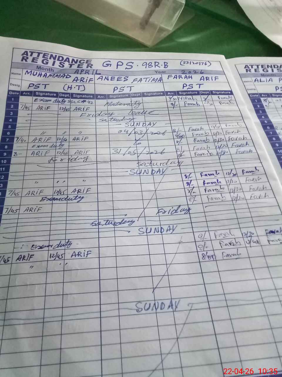 | 33**** | Mu**** Ar**** | PST Arts | Regular | 0 | 0 | 0 | 0 | 0 | 0 | 0 | 0 | 0 | Exam Duty |