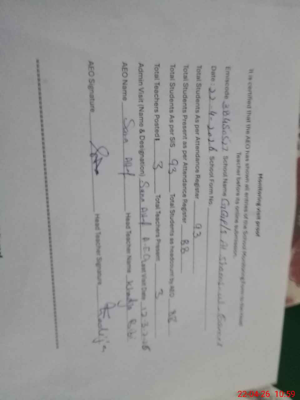 | Certified that this School was Inspected by the Undersigned MEA/DMO Today and the Information Stated Above is as Per Record. | |||||