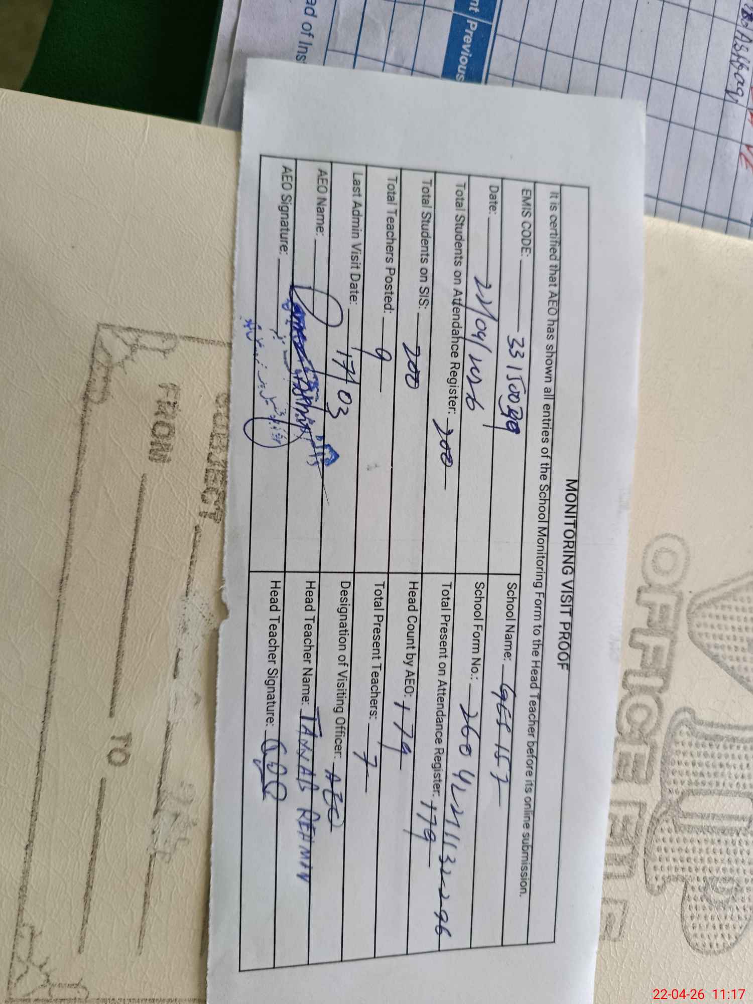 | Attendance Register | Head Teacher | MEA with School | Visit Proof |