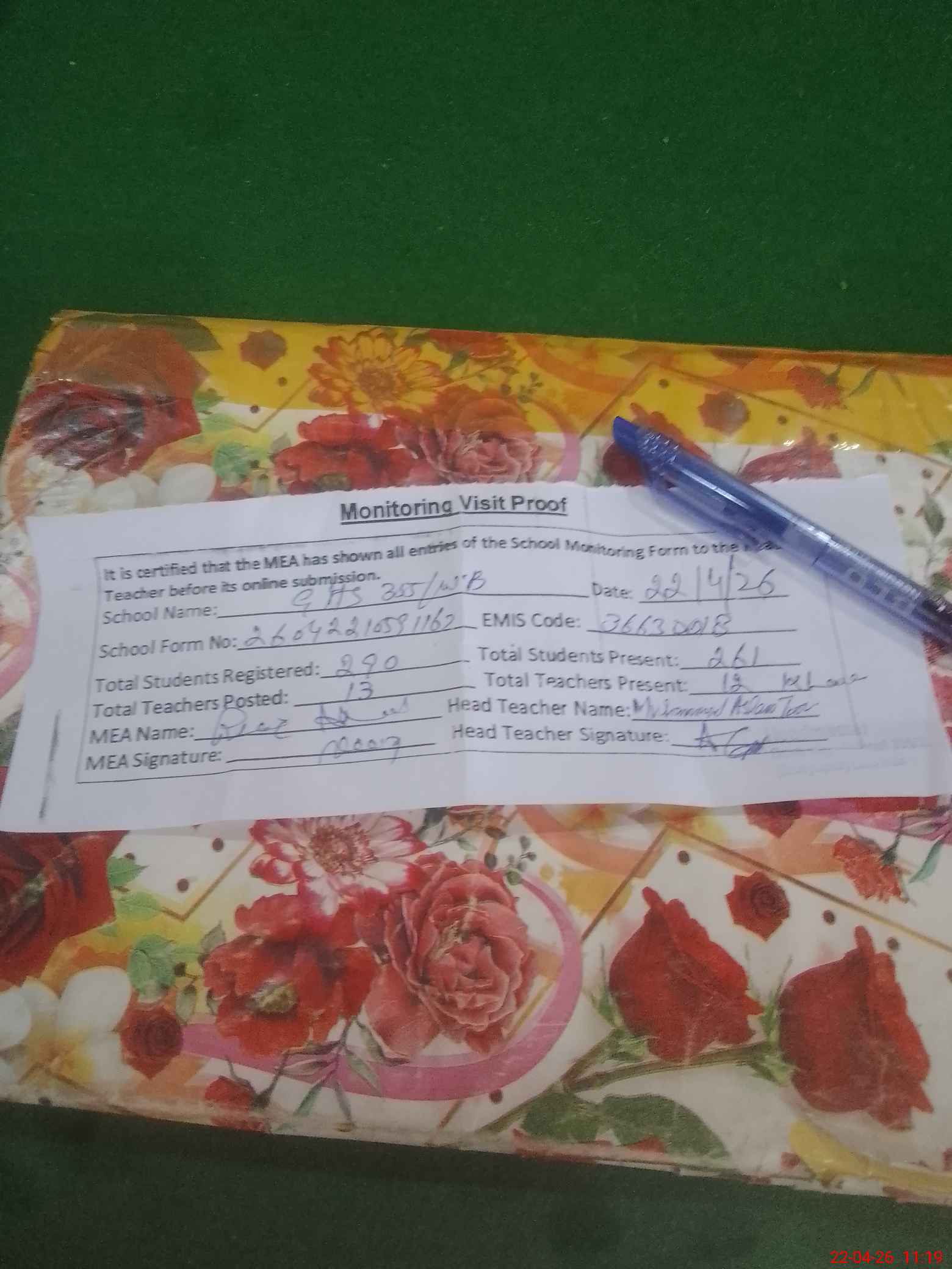| Attendance Register | Head Teacher | MEA with School | Visit Proof |
