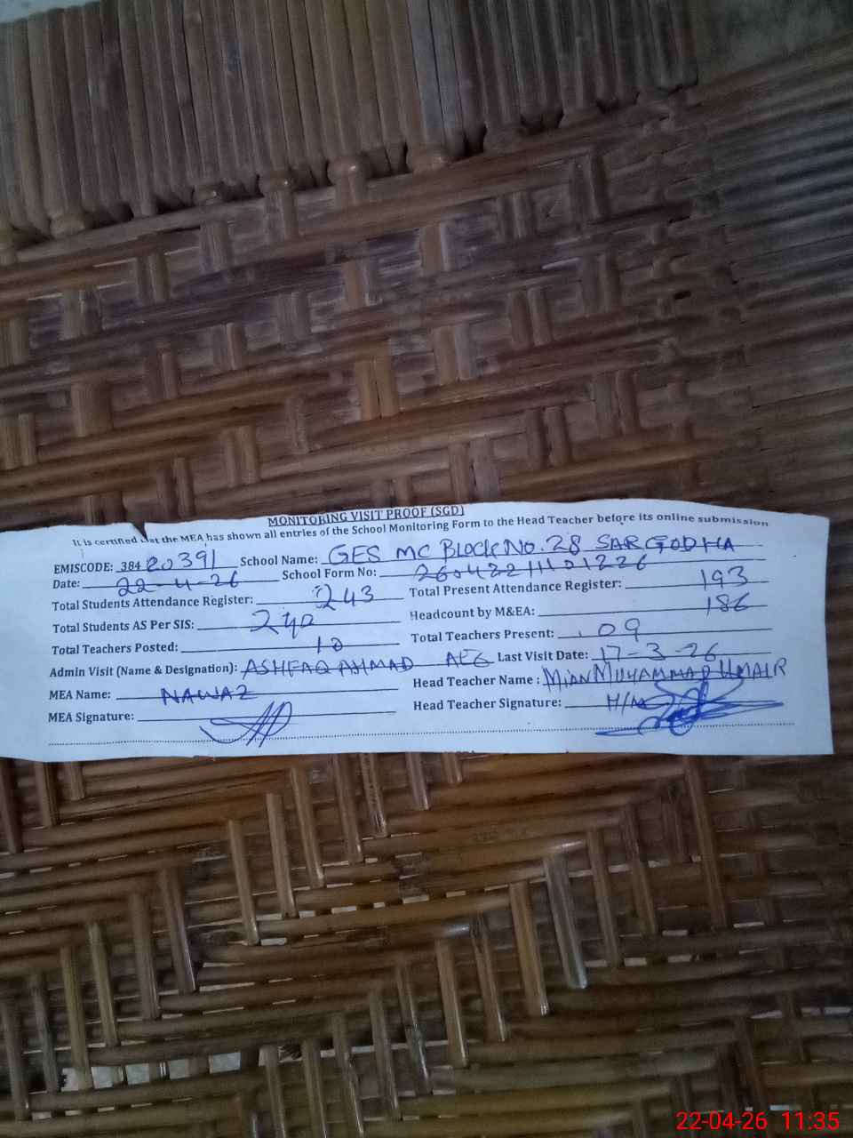 | EMIS Code: 38420391 | Name of School: GES MC BLOCK NO.28 SARGODHA | |||