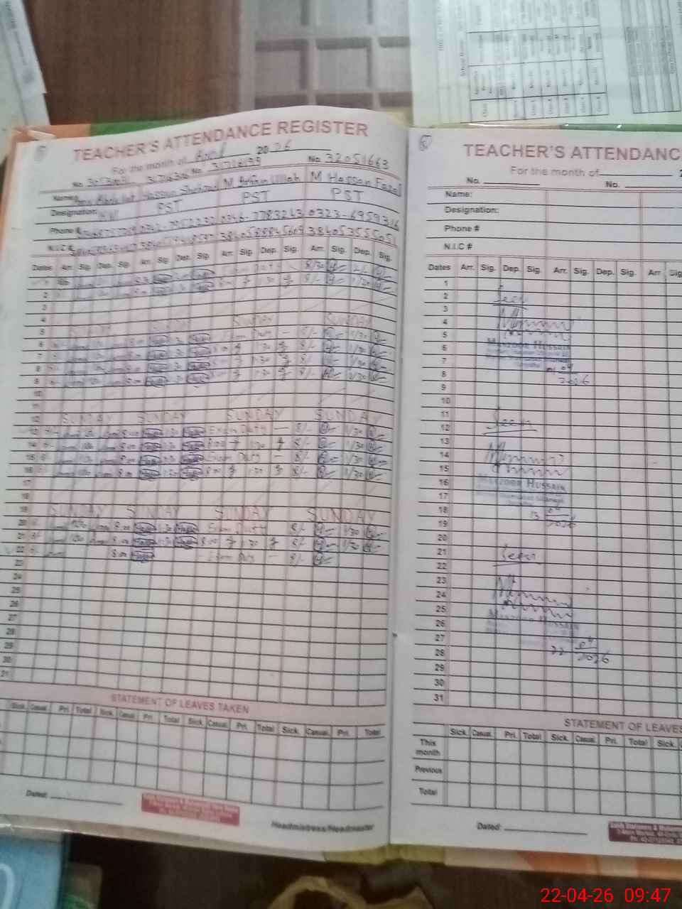 | CNIC | Full Name | Designation | R/C | Absence During Last Calender Month |