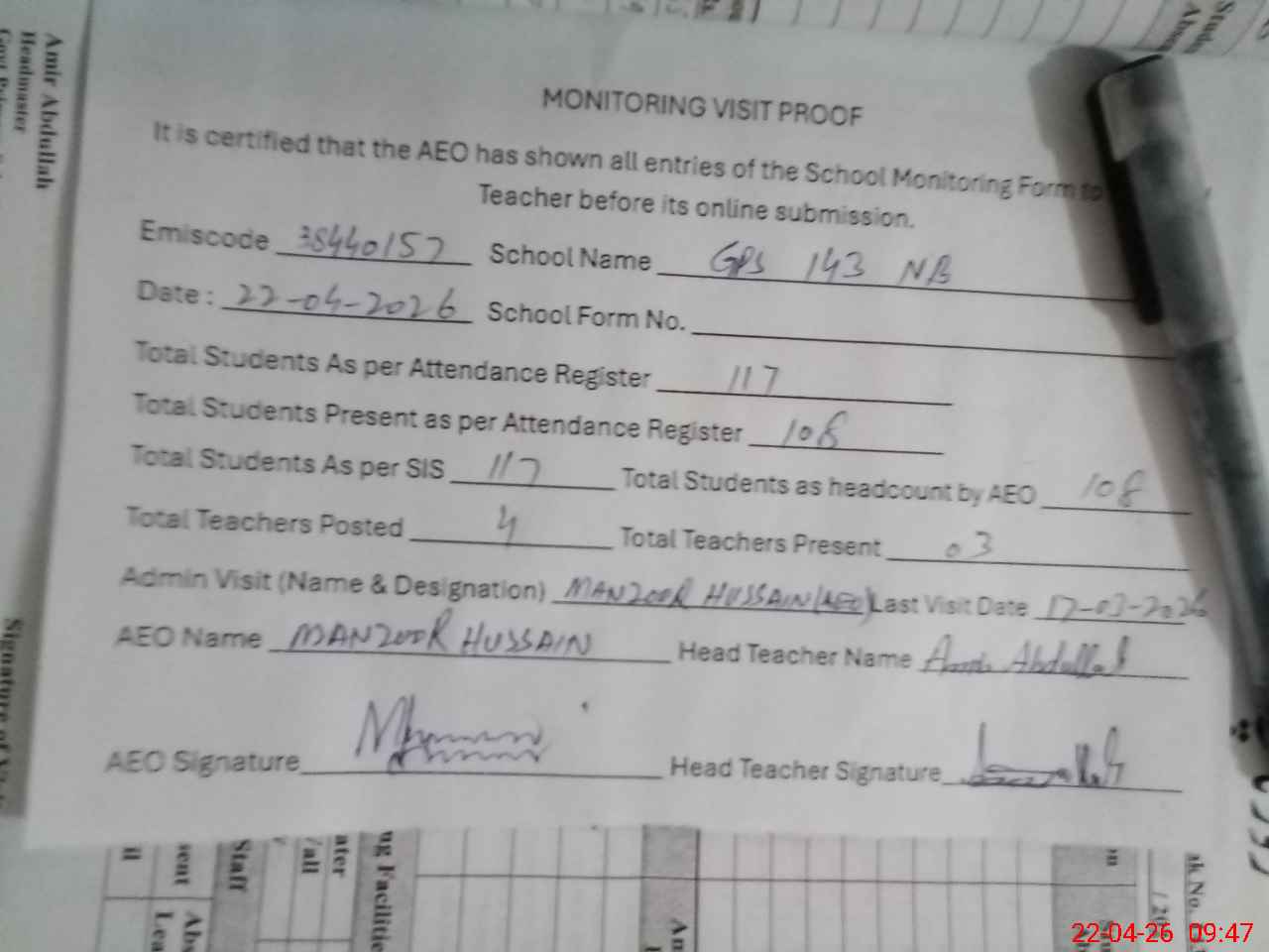 | Attendance Register | Head Teacher | MEA with School | Visit Proof |