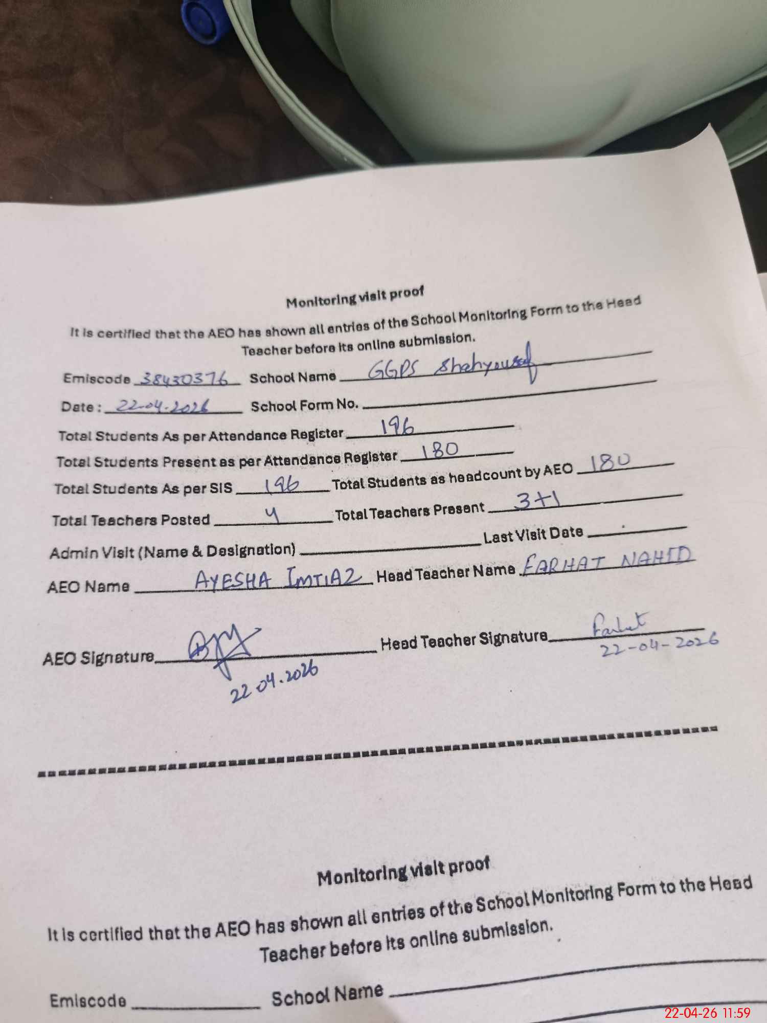 | Attendance Register | Head Teacher | MEA with School | Visit Proof |
