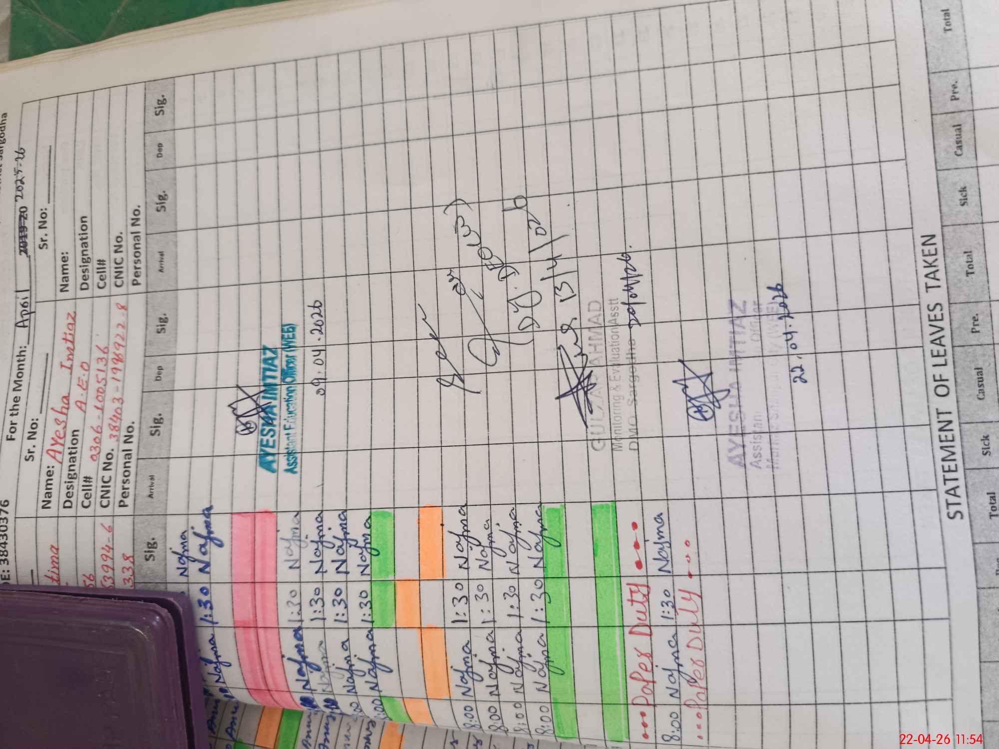 | CNIC | Full Name | Designation | R/C | Absence During Last Calender Month |