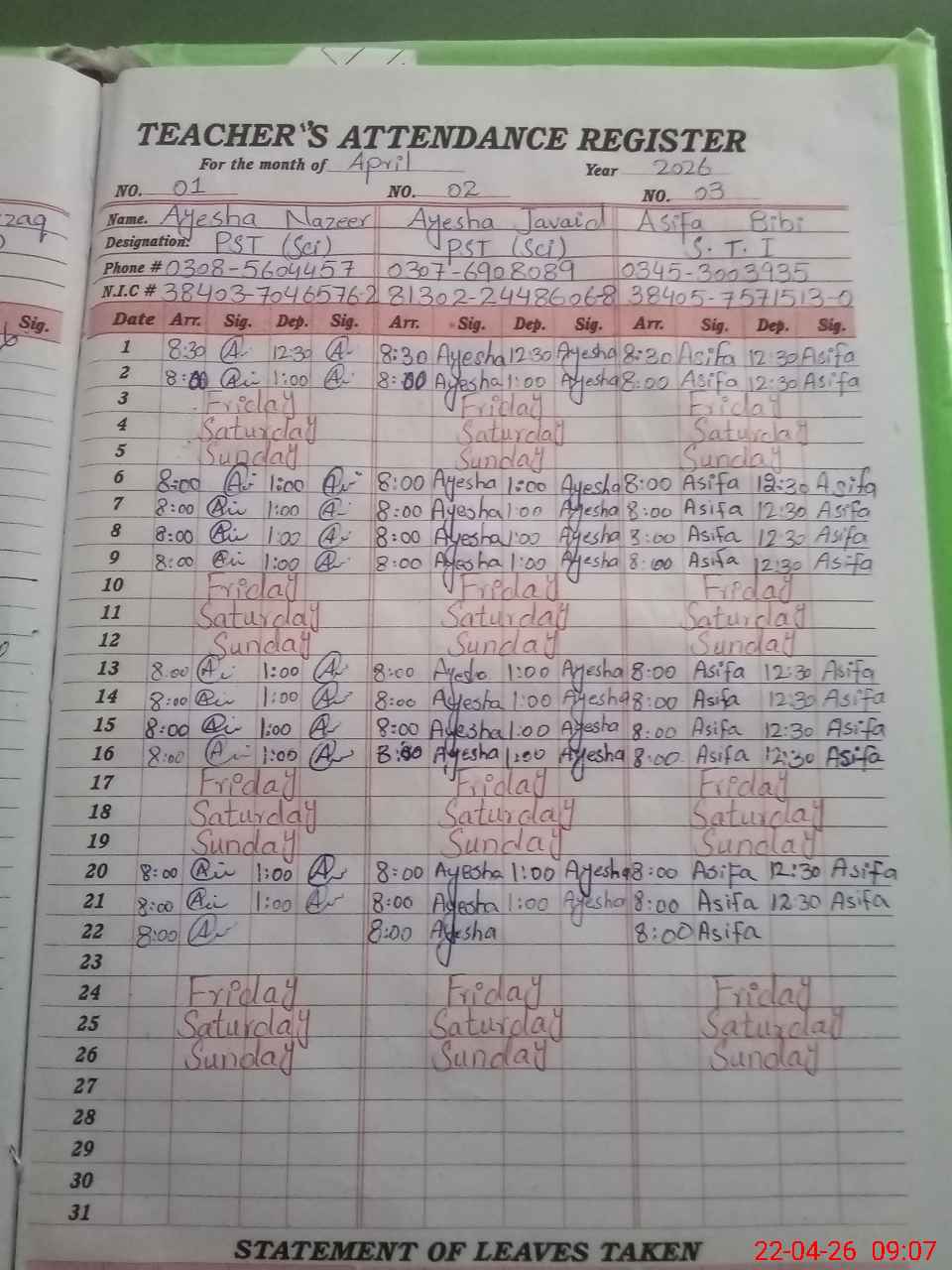 | CNIC | Full Name | Designation | R/C | Absence During Last Calender Month |
