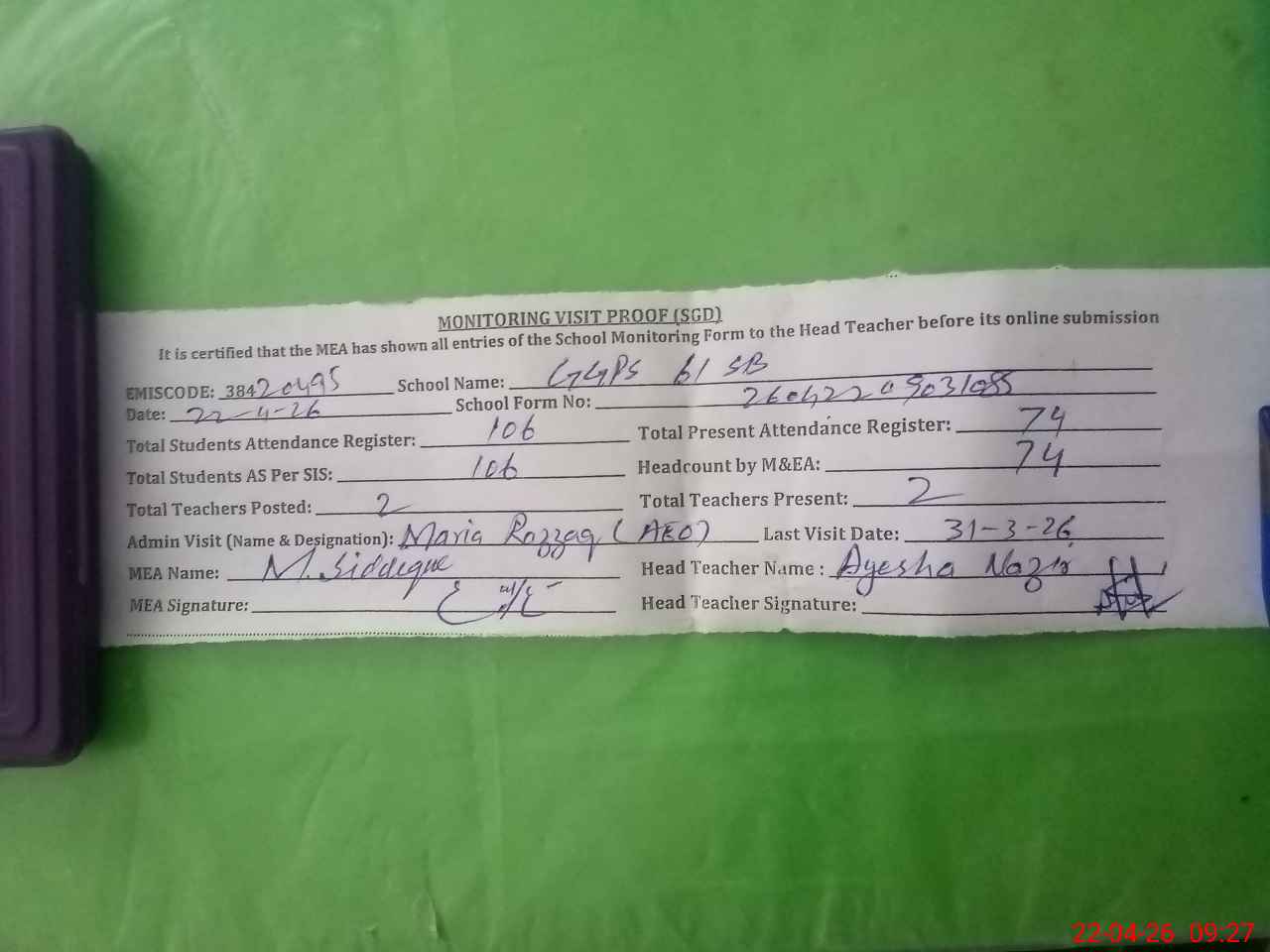 | Attendance Register | Head Teacher | MEA with School | Visit Proof |