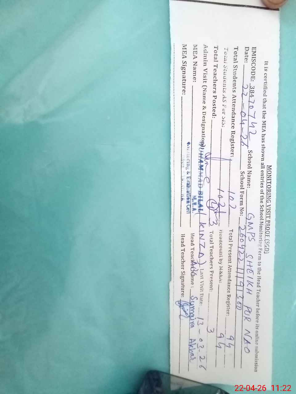| Attendance Register | Head Teacher | MEA with School | Visit Proof |