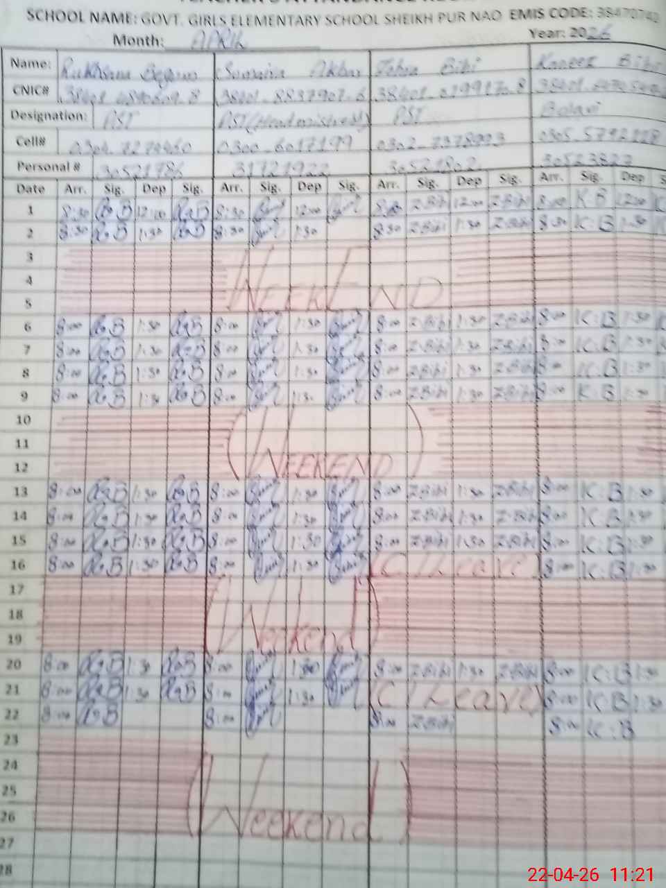 | CNIC | Full Name | Designation | R/C | Absence During Last Calender Month |