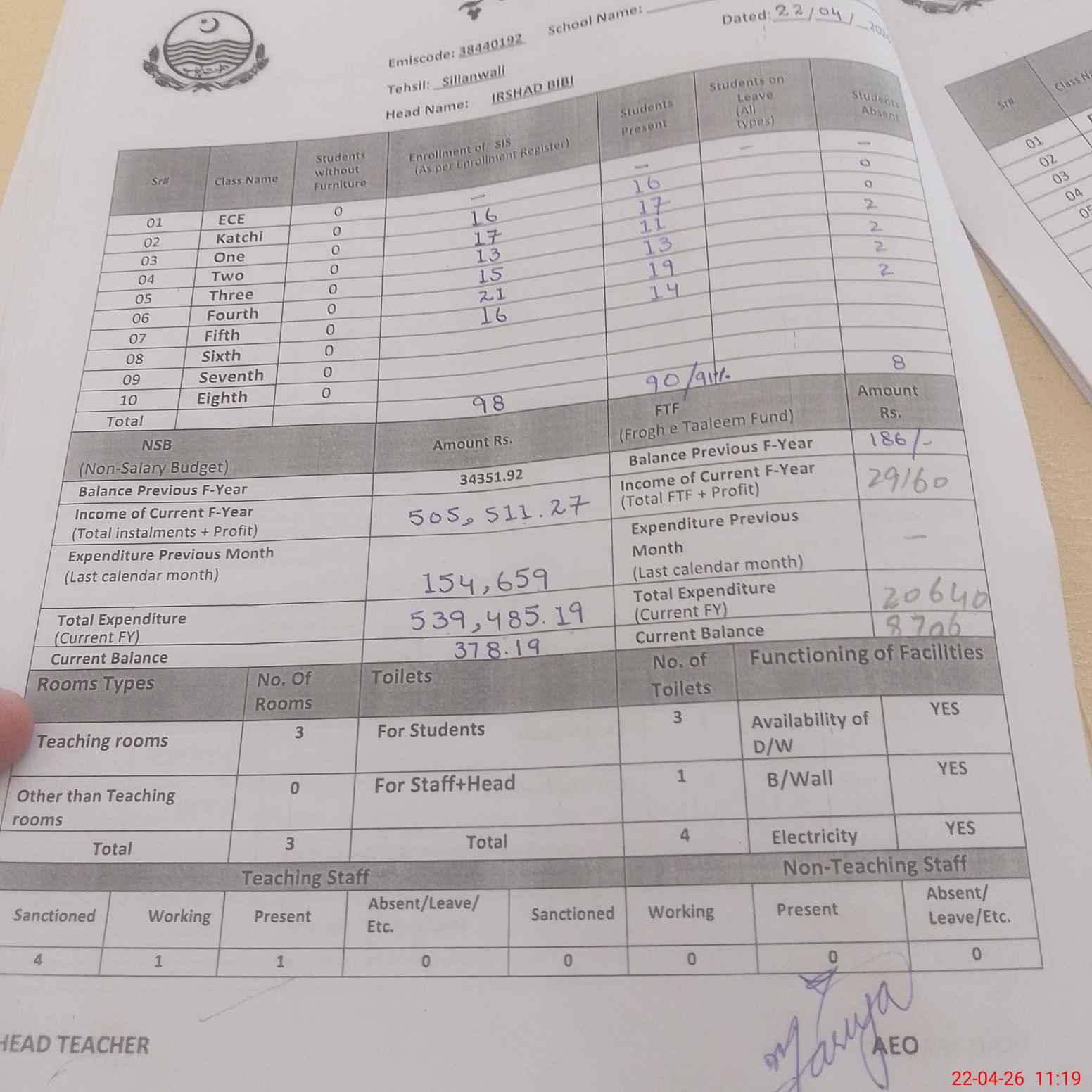 | District: SARGODHA | Tehsil: SILLANWALI | Markaz: NISHTARABAD - FEMALE | Level: Primary | |