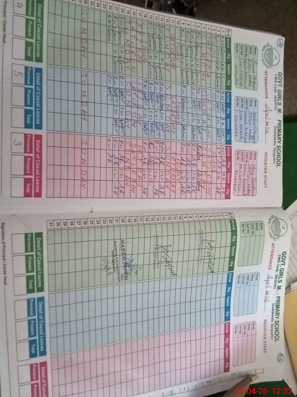 | CNIC | Full Name | Designation | R/C | Absence During Last Calender Month |