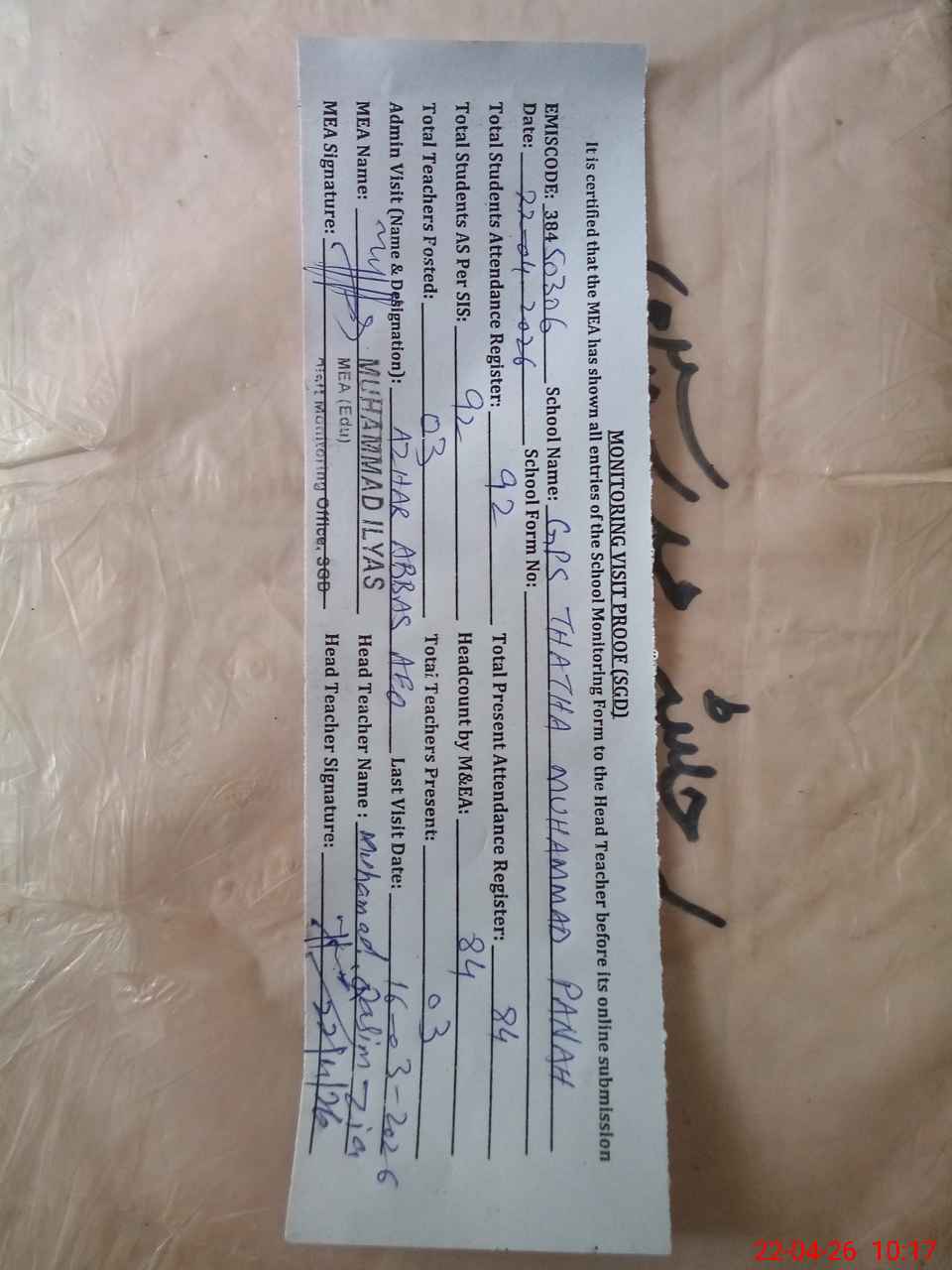 | EMIS Code: 38450306 | Name of School: GPS THATHA MUHAMMAD PANAH | |||