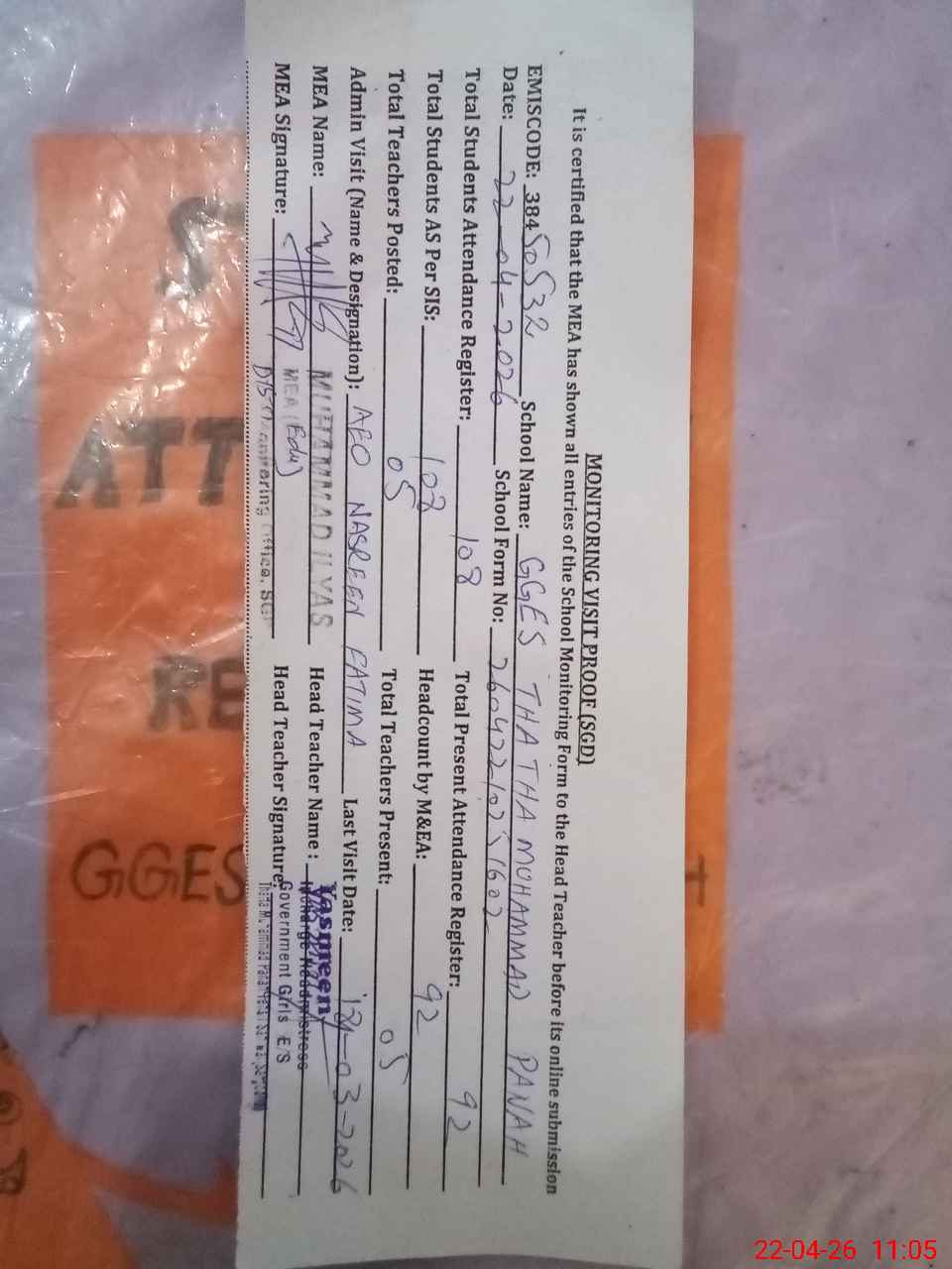 | Attendance Register | Head Teacher | MEA with School | Visit Proof |