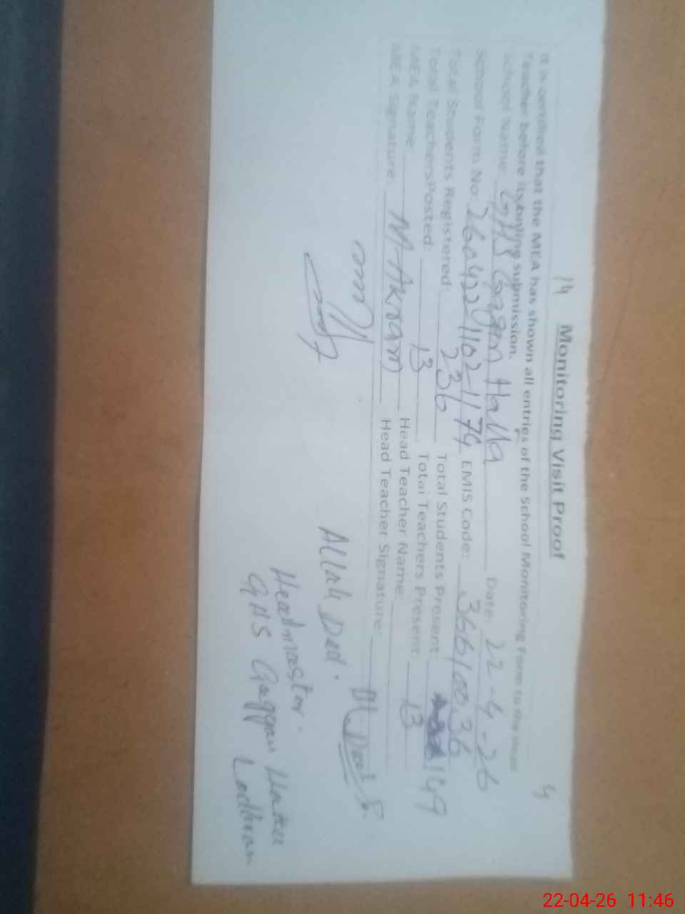 | Attendance Register | Head Teacher | MEA with School | Visit Proof |