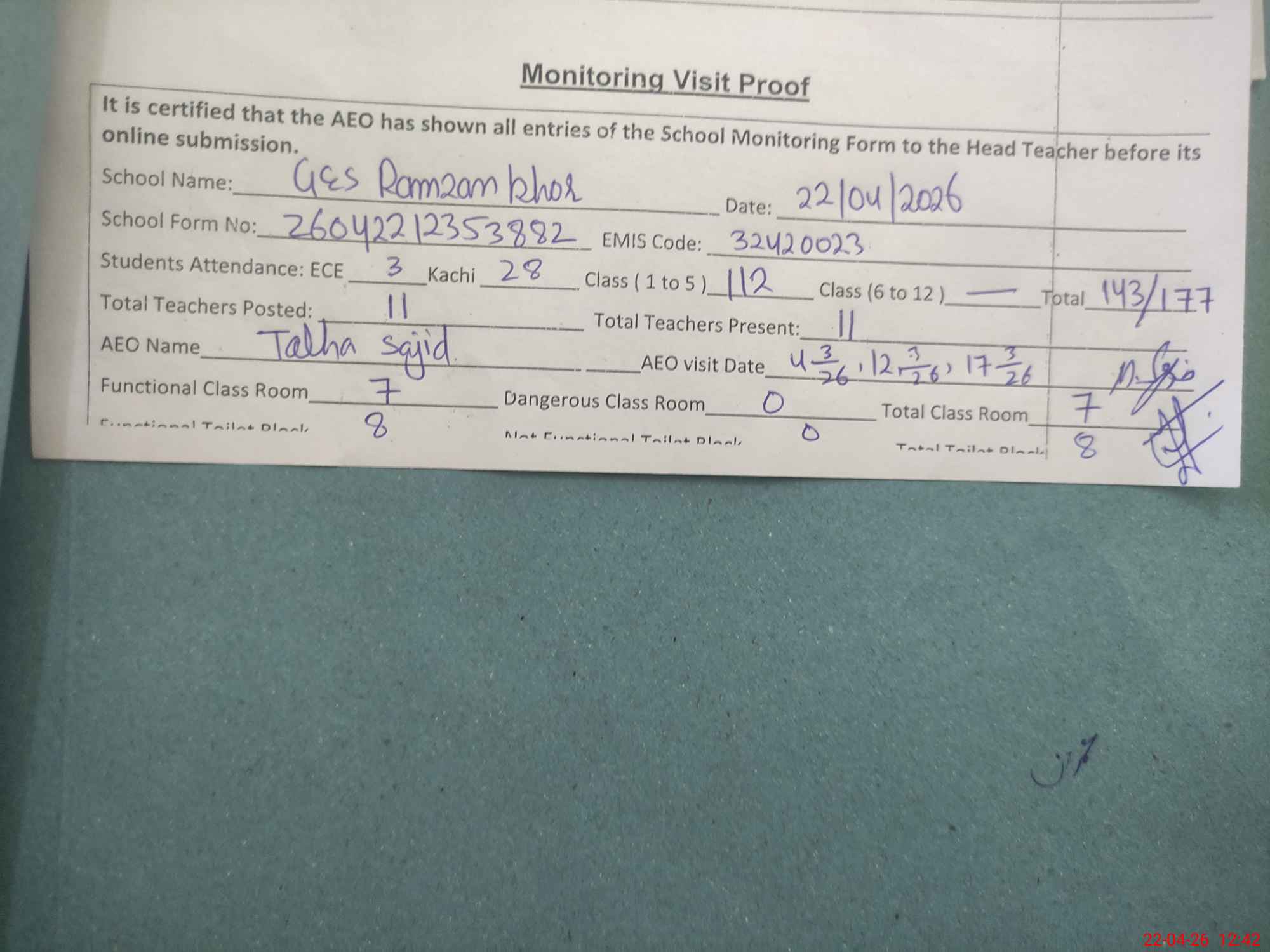 | Attendance Register | Head Teacher | MEA with School | Visit Proof |
