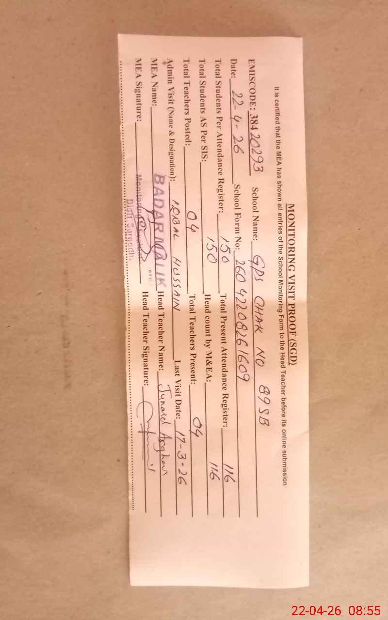 | EMIS Code: 38420293 | Name of School: GPS CHAK NO.89 SB | |||