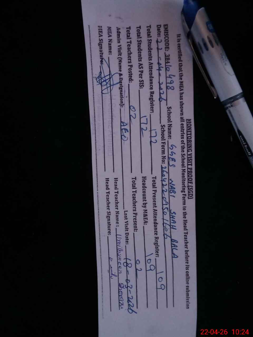| Attendance Register | Head Teacher | MEA with School | Visit Proof |