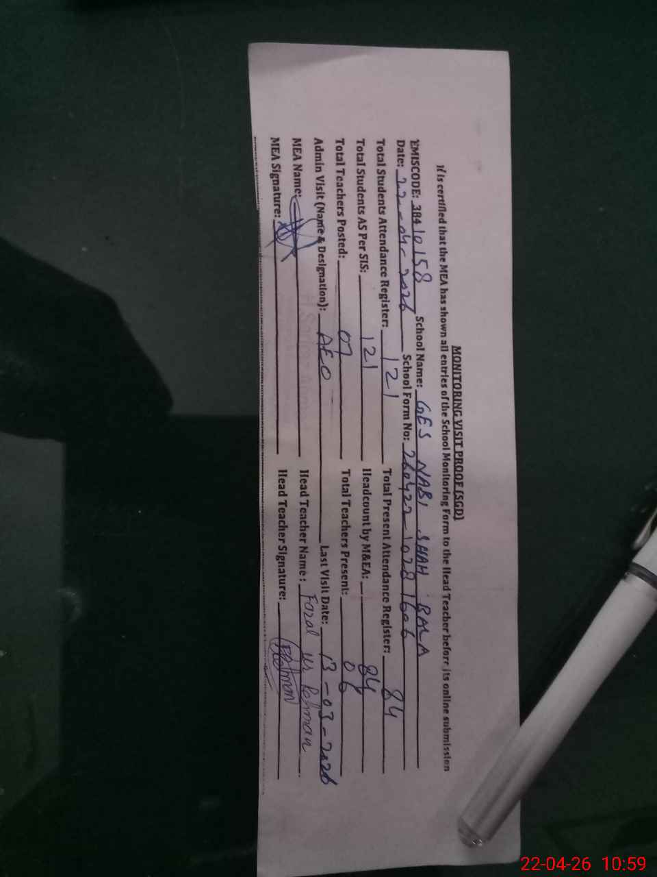 | Attendance Register | Head Teacher | MEA with School | Visit Proof |