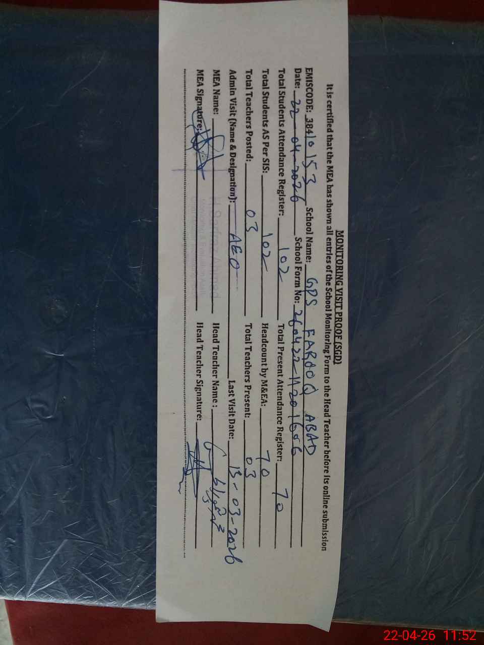 | Attendance Register | Head Teacher | MEA with School | Visit Proof |