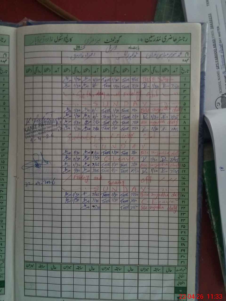 | CNIC | Full Name | Designation | R/C | Absence During Last Calender Month |