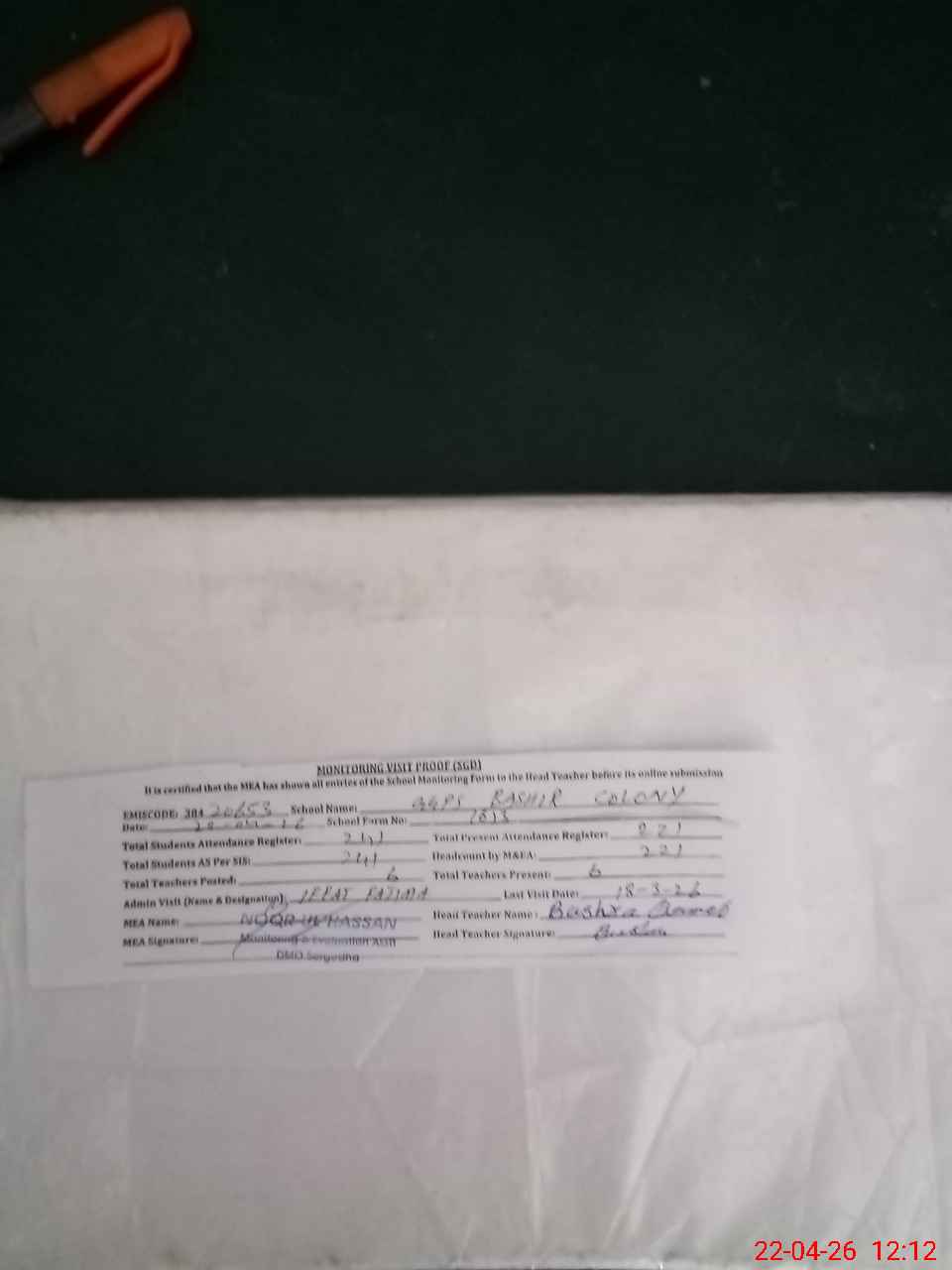 | Attendance Register | Head Teacher | MEA with School | Visit Proof |