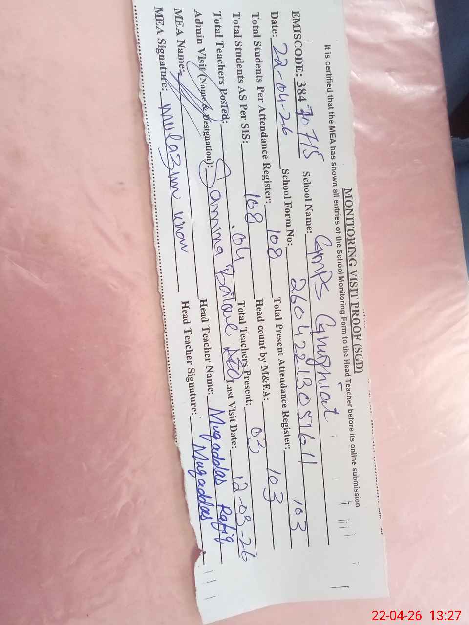 | Attendance Register | Head Teacher | MEA with School | Visit Proof |