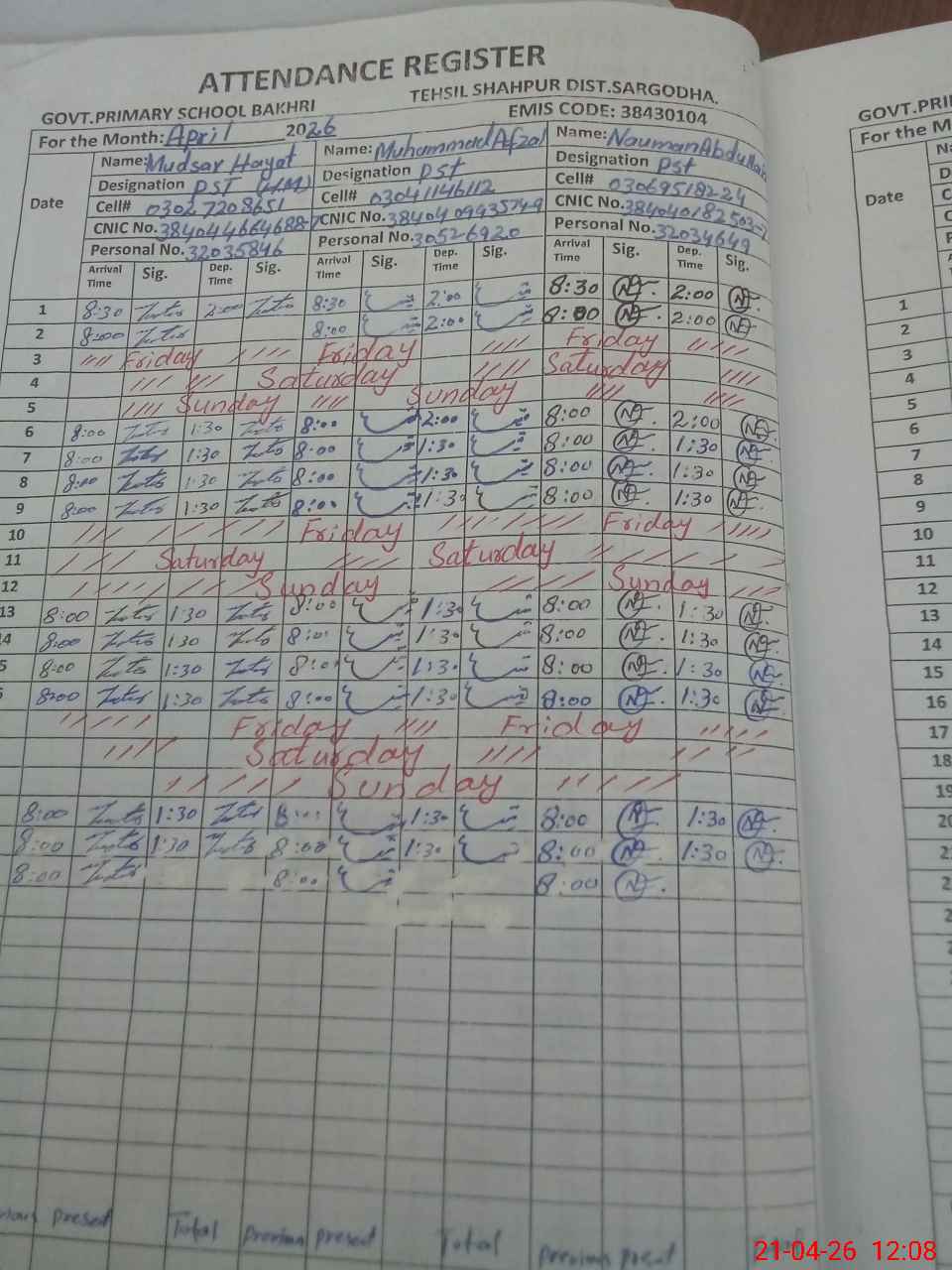 | Name: MU**** HA**** Designation: (School Headmaster's/Headmistress's) PST Phone/Cell Number: 03**** |