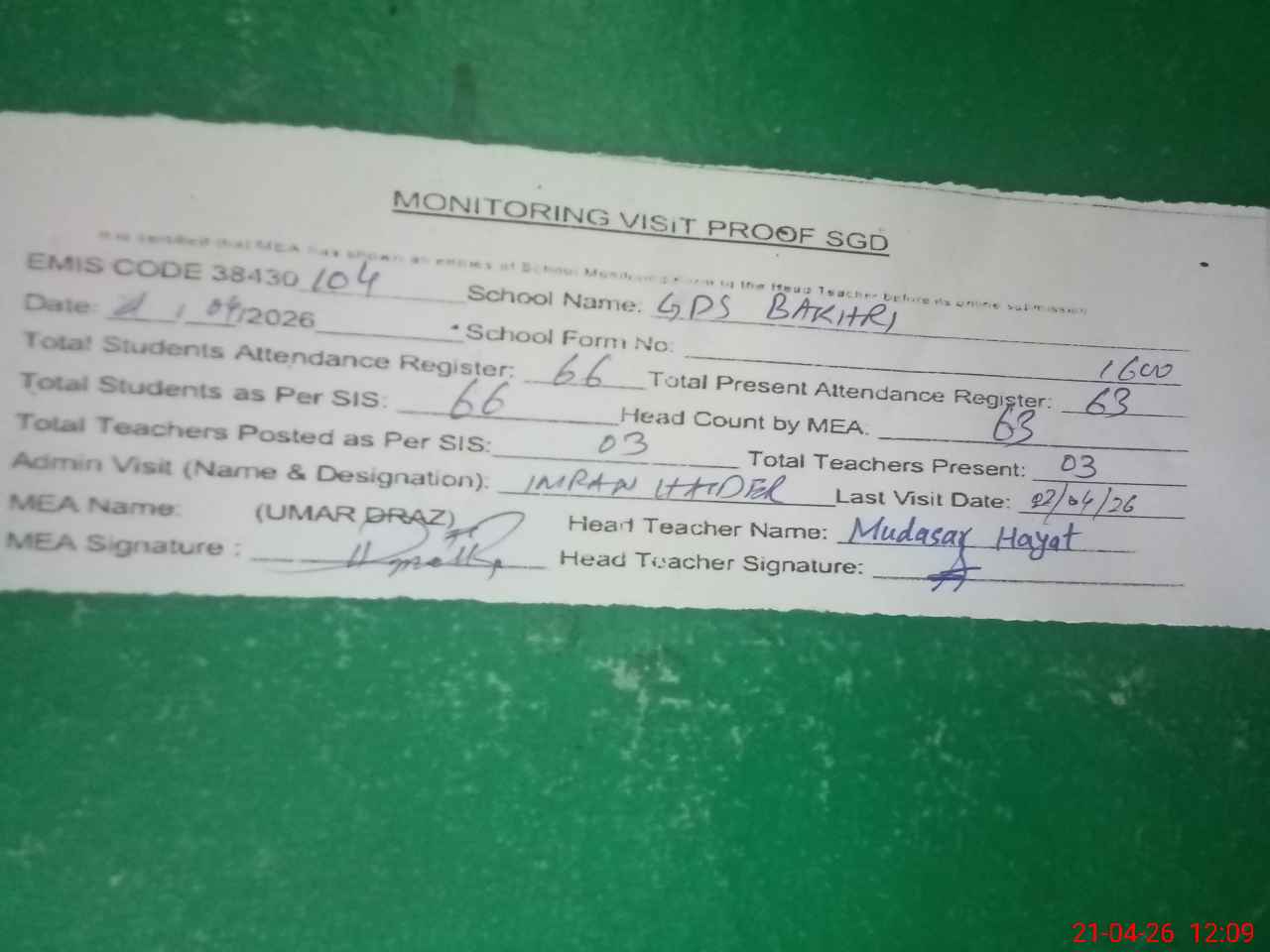 | Attendance Register | Head Teacher | MEA with School | Visit Proof |