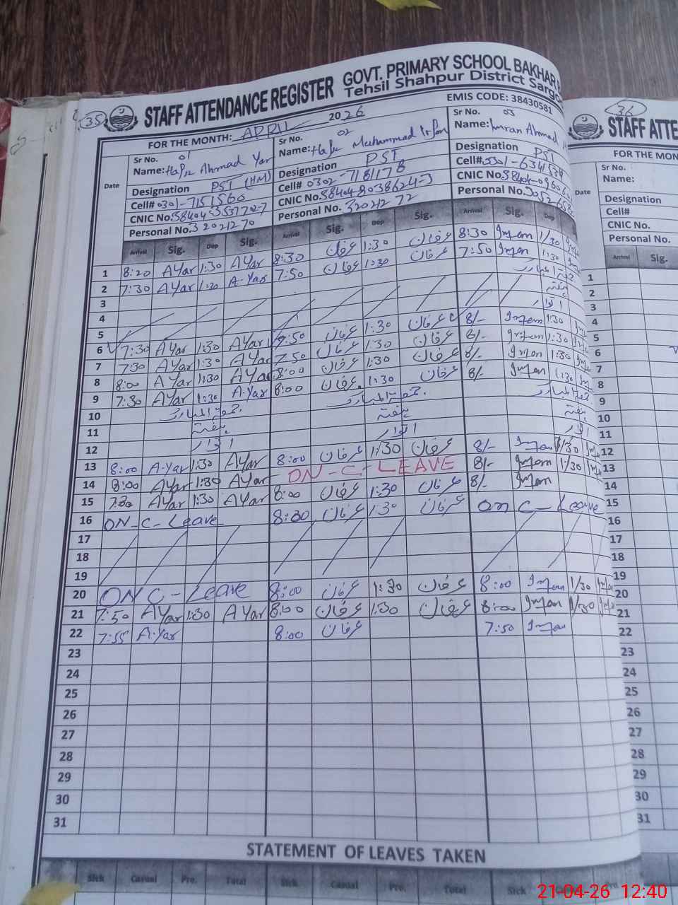 | CNIC | Full Name | Designation | R/C | Absence During Last Calender Month |