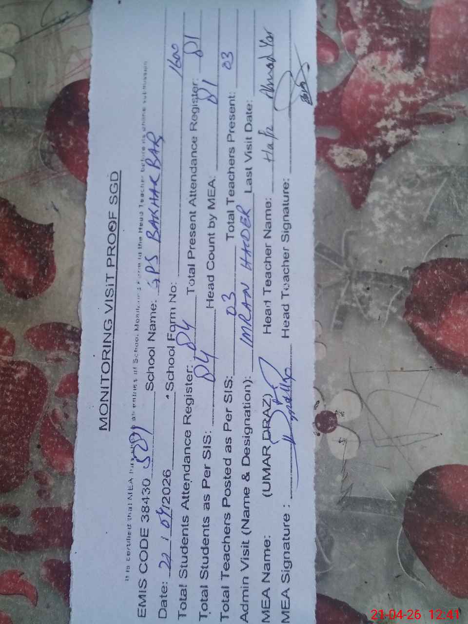 | Attendance Register | Head Teacher | MEA with School | Visit Proof |